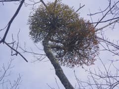 鞍部から尾根を急登する。ツツジの小枝がちょっと煩いが藪というほどではない。木の高い梢には大きくて丸いヤドリギがいくつも付いている。赤い実がたくさんなっていて綺麗だ。クリスマスの飾りに良さげである。