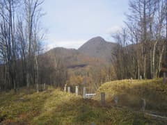 林道脇に軽トラがあり、人はいなくて荷台でビーグル犬が大人しく留守番をしている。私を見ると荷台から飛び降りて擦り寄って来たので、よしよし可愛いのう、と撫でてやる。しかし、この軽トラはハンターの車では。と、左の谷底でパーンという甲高い銃声。もう狩猟が解禁されているのか…。