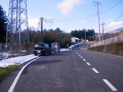 稜線から杉林に覆われた急峻な窪に入って急降下する。山道から簡易舗装の道に変わった所でスパッツとチェーンスパイクを外す。ここから栗生神社までは僅かな距離である。
