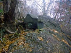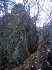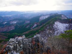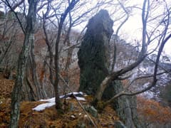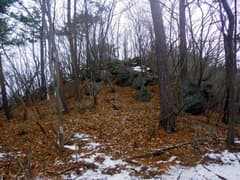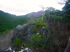 左から回り込むようにして、杉林に覆われた稜線を辿る。稜線から東へ少し突き出た展望の良い岩場があり、その上に立つと五覧田城の稜線や鳴神山を遠望し、歩いてきた南尾根を振り返って一望する。この展望岩場のすぐ先に、名状し難い(^^;)奇岩がある。