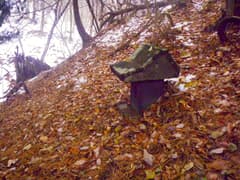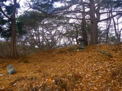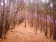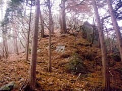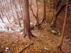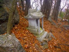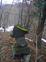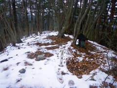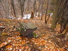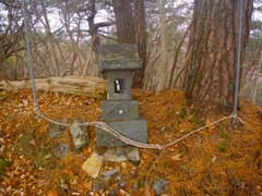 稜線を直進し、急坂を登ると赤松が立ち並ぶ尾根上に出る。あれっ、そういえば峠の近くにもう一つ石祠があるんじゃなかったっけ。引き返して探すと、峠の東斜面(急坂の右側)に五つ目の石祠を見出だす。危うく見逃すところだった。みー猫さんの情報に感謝。