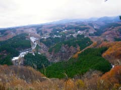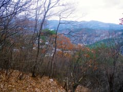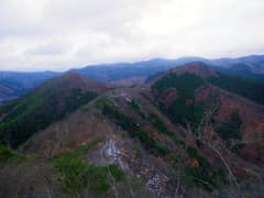 正面の篠竹藪を搔き分けて強引に突破すると、左斜面が伐採されて開けた尾根に出る。左には小黒川の谷を隔てて赤城山東面が広がり、鹿角の集落や県道沼田大間々線が眺められる。あの県道は車で何度も行き来したことがあり、そういえば、通る度にこちらの山稜を眺めていたけれど、栗生山の南尾根とは意識していなかったな、と気づく。灰色の雲に隠れて、赤城山の天辺は見えない。