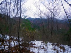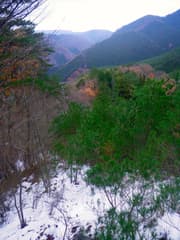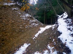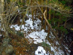 ここから南尾根三つ目の峠への下りとなる。北向きの斜面で雪が多いので、スパッツとチェーンスパイクを付ける。チェーンスパイクは数年前に買ったものだが、実際に使うのは今日で2度目くらい。湿った土にはグリップが効くが、グサグサの雪には効果はあまりない。しかも、すぐに雪がくっついて高下駄状態になるので、雪をはたき落としながら歩く。でもまあ手軽なので、里山の雪には丁度良いアイテムではないかと思う。