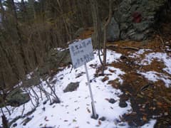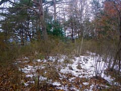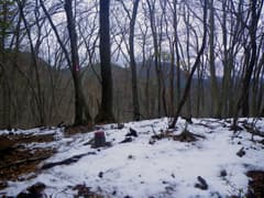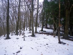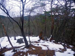 頂上から奥へ稜線を進む。関東甲信地方に一昨日降った初雪が薄く残っている。晴れの予報に反して上空は厚い雲に覆われてしまい、寒々しい天気。僅かに登って605m標高点に着く。雷電山の最高地点ではあるが、ポサポサの篠竹藪に覆われ、特別な物は何もない。