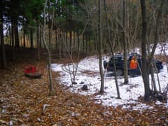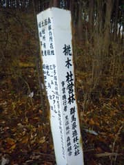伐採地と松林の境界の尾根を下って鞍部に着く。古い地形図を見ると、栗生山南尾根には破線路が越える峠が三つあり、ここがその一つ目になる。放置されたクローラ車の他に一台の大型SUVがあり、橙色のジャケットを着た年配の男性が二人いる。ハンターだ。挨拶して「どこまで行くの」「栗生山まで」等の話を交わす。この峠の名はご存知か尋ねたところ、そこに何か書いた物があるよ、とのお答え。見ると「椛木社営林」と書いた森林組合の標識がある。これは峠名を示す物ではないが、椛木峠と呼んでも良いのかも。
