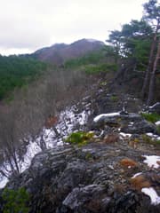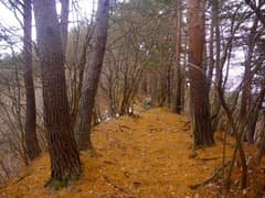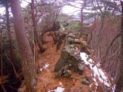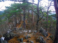 峠から急坂を再度登り、赤松林の緩やかな稜線を辿る。木の間越しに栗生山を見て左に折れると、稜線上に露岩が多く現れる。