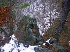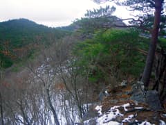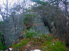 さらに大きな岩場が現れ、上を辿っていくと切れ落ちた崖に突き当たる。これは降れないと思ってだいぶ戻り、右から巻いて稜線に復帰したが、崖を下から見てみれば右側(上から見れば左側)が簡単に降れたようである。ここはコース取りを失敗した。