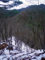 708m三角点峰から南尾根二つ目の峠に向かって下る。樹林の切れ目から、まだまだ遠い栗生山を望む。この下りは北面にあるため雪が多く、しかもグザグザに柔らかくなった雪なので大変滑り易い。灌木を摑みながら、おっかなびっくり下る。