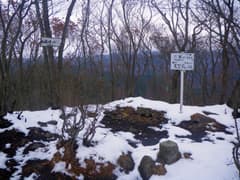 岩場の通過で少々緊張したが、栗生神社からの登山道と合流して一安心。「栗生山頂200m→」の道標があり、ひと登りで栗生山の頂上に着く。1997年2月以来、2回目の頂だ。三角点標石と古びた山名標がある。ここは展望がないので、「←展望岩まで50m 石宮まで200m→」の道標に従って、まず西の展望岩に行ってみる。