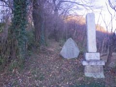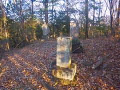 ここからは標高が上がった尾根歩きなので、藪漕ぎの心配は少ない(実際、藪はほとんどない)。北に向かって雑木林や杉林に覆われた尾根を辿る。次のピークには2基の石祠が東を向いて祀られている。片方の石祠には「文化元甲子(1804)四月吉日」の銘がある。
