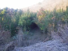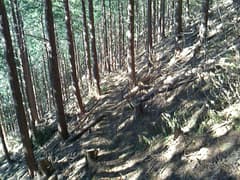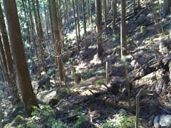 山道から程なく古い作業道に出る。杉の葉や倒木が覆い被さって荒れているが、道が全くないのに比べれば速くて楽だろう。ところどころで杉林の間から西日の差し込む谷間を下り、彦間川沿いの県道に出る。