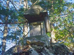 尾根を急登し、大岩を右から巻いて登ると、石尊山の頂上に着く。西面は急傾斜で切れ落ち、山麓の塩田集落を俯瞰する。石祠は屋根だけが転がっている。杉木立ちに囲まれて西面以外の展望はないが、信仰の山らしい雰囲気がある。腰をおろしてしばし休憩。山専ボトルに入れてきた熱いココアを飲んで、パンを齧る。