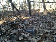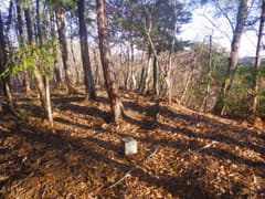 鍋沢山頂上は広く平坦で、雑木がポサポサと生えている。雑木の隙間のごく小さな空き地を取り囲んで「鍋沢山562.2m」の文字が掠れた山名標やフジオカT.K氏のテープがあり、三角点標石はどこ?と思ったら、空き地の真ん中で落ち葉に埋もれていた。ここも小野久保山に並ぶ超地味〜な頂である。