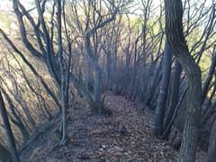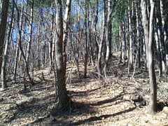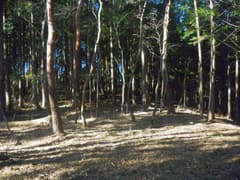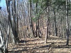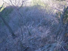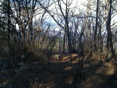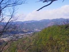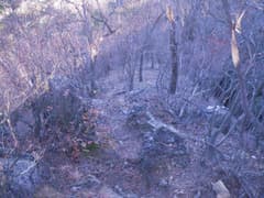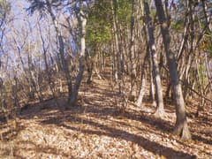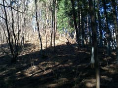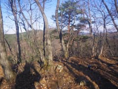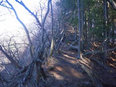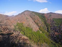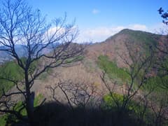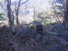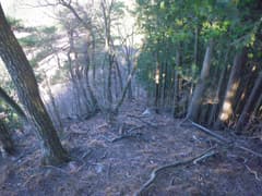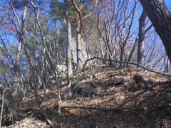 すぐに尖った小ピークを越えると、雑木林の痩せ尾根の下りとなる。歩く幅は十分あるので通過は問題ないが、両側は下が見えない切れ落ちた急斜面なので要注意。下山は楽勝と思っていたが、小さなピークの登降もあって鞍部まで意外と遠い。行く手に奈良部山や丸岩岳を望む個所があり、山奥深く入り込んだ感が強まる。鞍部からの下りは破線路をあてにしているが、大丈夫だろうか。既に14時に近く、日没(16時半)まで時間の余裕がそうある訳ではないので、少々不安になる。