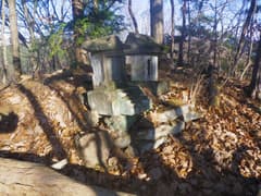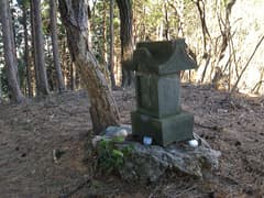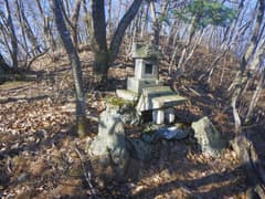 雑木林と杉林が混じる尾根を辿る。木立を透かして北東に大鳥屋山が眺められ、平坦な山並みの中で大きな台形の山容が一際目立っている。右から閑馬川左岸の尾根が近づいて合流する地点に石祠がある。扉に「三峯山 琴平山」、側面に「明治○○○年四月吉日」と彫られている。神酒を供えた跡があり、今も参拝されているようだ。