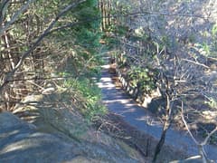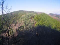 441m標高点を越えると短いが急な下りとなり、小さな岩場がある。行く手になだらかで杉林に覆われた小野久保山が眺められる。
