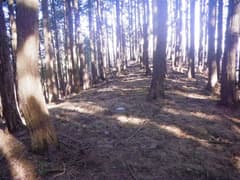 細い尾根を辿ってなだらかな尾根に入る。薄暗い杉林の中を緩く登って、平坦な小野久保山頂上に到着する。山名標の類はなく、三角点標石だけがぽつねんとある。展望も全くなく、超地味な頂である。