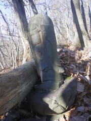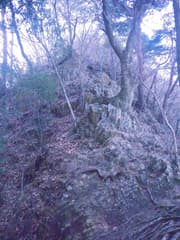 次の小ピークを越えるとザレた岩稜の急降下となり、行く手に石尊山を見ながら、鞍部まで標高差約100mを一気に下る。ここは低山らしからぬ険しさがある。下り着いた鞍部には首なし地蔵があり、東西に古の峠道と思しき道型が微かに残る。