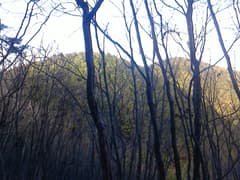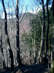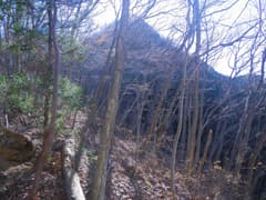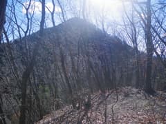 鞍部から雑木林の尾根を登る。振り返ると小野久保山の北峰が鋭く聳え、こちら側から見ると(岩稜が日陰に入っているせいもあるが)、あれは登れるんだろうか、と感じられるくらい険しく見える。