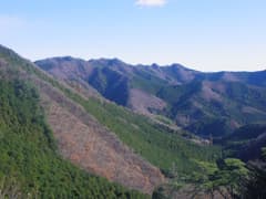 さらに登ると、木の間越しだが西側が眺められる個所もあり、多高山から野峰へ続く尾根、その奥に桐生川右岸の白萩山や残馬山を望む。今日の行程の終着点の飛駒盆地もようやく見えてきた(とは言っても行程はまだ半分だ)。