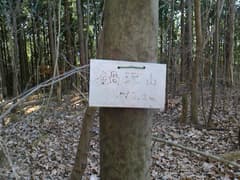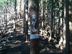 杉林の中を下って着いた鞍部には、「カゲ山」(影山さん?)と大書きされた杉の木が立つ。西側に下ると杉植林帯の中に山道があり、これで一安心する。