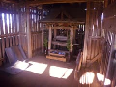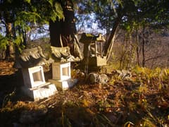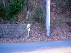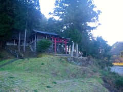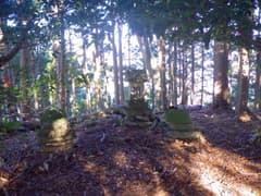 神社裏手の車道の適当な所から、尾根末端に取り付く(最初、中妻集落から有戸山への参道を辿ろうとしたが、出入り口のない防獣フェンスに阻まれて断念)。けもの道を辿って急斜面をジグザグに登り、尾根末端の標高180m圏のピークに着くと3基の石祠がある。胴体部は比較的新しいが屋根は古く、再建されたもののようだ。