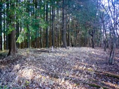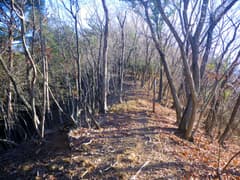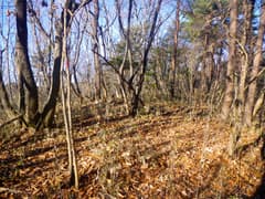 注連縄代わり?の紐を潜って尾根道を東に向かう。少し下ったところの鞍部で、左から登ってきた踏み跡(これが多分、中妻からの参道)を合わせる。杉林を抜けて雑木林の尾根を登ると、有戸山の頂上に着く。
