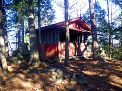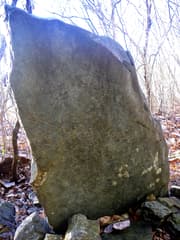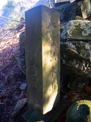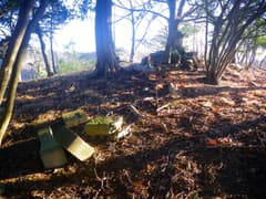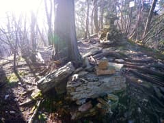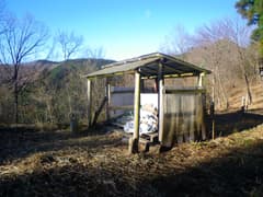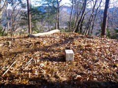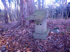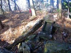 有戸山から、樹林中に篠竹がポサポサと生えた尾根を緩やかに辿ると、古越路峠からの尾根が合流する380m圏峰の山頂に着く。「嘉永二酉(1849)年三月吉日 世話人 立川忠蔵 石川紋蔵 落合沢右ヱ門」と彫られた石祠1基がある。この石祠は台座と胴体の向きが合っていない気がする。3.11で倒れて、立て直したときに間違えたのかも(後日、2009年の写真を見つけて較べると、やはり胴体の向きが逆だ)。