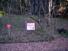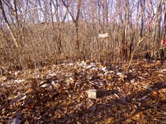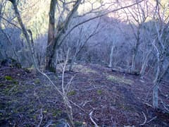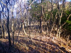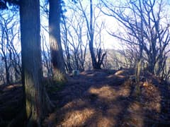 園地の脇を通り、明瞭な山道を辿って杉植林と雑木林の境界を緩く登ると、愛宕山の頂上に着く。頂上は灌木藪に囲まれ、山名標や赤テープが小枝にぶら下がり、落ち葉に埋もれて三角点標石がある。折から日差しも傾いて、訪れる人も稀な寂峰の雰囲気が強い。