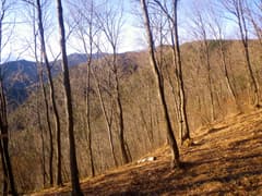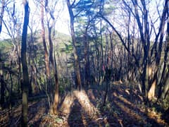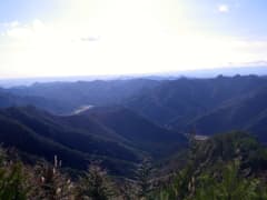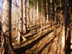 後は下山して、蓬山ログビレッジに戻る。頂上からの最短ルートも考えたが、灌木藪が酷いし日没(16時半)が近いので、無理せず往路を林道まで戻る。それから西へ林道を辿り、途中からショートカットして、杉林に覆われた枝尾根を下る。沢に降り立つと荒れた作業道があり、これを辿ると民家の脇を抜けて、首尾よく旗川沿いの県道に出る。駐車地点までは県道を歩いて僅かの距離である。まだ日が沈む前に桐生への帰途についた。