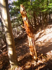 不動岳から緑陰が多い鞍部に緩く下る。鞍部付近に、たそがれさんの記事以降、どういう訳かネットの山行記録で定点観測されている立ち木を通る(^^)。後日調べると、褐色腐朽菌にやられるとリグニンが残留してこんな色になるそうである。