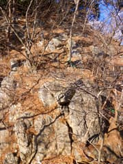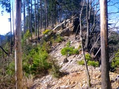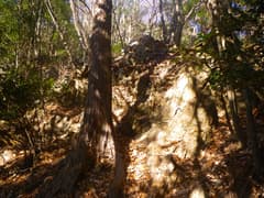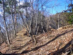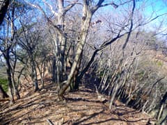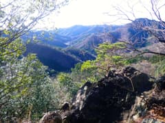 石尊山への登りに転じると、露岩の多い急坂となる。途中、南麓を見おろす岩場がある。小さな岩場を越え、急登をこなすと石尊山頂上に着く。