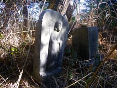 林道を少し西に辿り、法面の階段から山道に入る。若い杉植林帯の中は枯れススキ藪が酷い。斜面をトラバースして一回切り返し、尾根上に出ると石仏と石塔がある。石仏は宝珠を持った地蔵菩薩だろうか。木漏れ日を浴びて穏やかな笑みを湛えておられる。石塔には、一部欠けているが「奉加造立 天明乙巳(1785)年七月吉日」の銘がある。