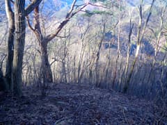 ここで東に下る一般登山道と分かれ、北西にほぼ平坦な稜線を辿る。北西の肩に着き、愛宕山との鞍部に向かって下り始める。愛宕山は遥か下で、出だしは尾根筋が判然としないが、少し下ればはっきりする。地形図の等高線の詰まり具合を見ての通りの凄い急勾配だ。標高差約150mを一気に下り、ようやく傾斜が緩くなって、牛の沢出原林道に着く。