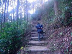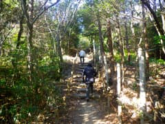 東谷山フルーツパークの第一駐車場に車を置く。フルーツパークは年末年始で休園中のため、駐車は少ない。東谷山はすぐそこの丘という感じの山だが、一応、登山靴に履き替えて歩き始める。「東谷山散策路」という大きな標識があり、その右手からヒサカキやアラカシなどの常緑樹の林の中の山道に入る。木の階段道が続き、良く整備されている。