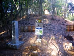 やがて樹林に覆われた小ピークの直下に登り着く。御影石に「史跡志段味古墳群南社古墳」と刻んだ立派な石柱があり、土管のような埴輪(のレプリカ)が並べられ、その後ろに小さな祠を祀った塚がこんもりと盛り上がる。説明板によると、志段味(しだみ)古墳群は4世紀前半から7世紀末(古墳時代前期から終末期)に造られた総数約70基の古墳からなる。この南社(みなみやしろ)古墳は4世紀中頃に築かれた円墳で、次のピークにある中社古墳に葬られた庄内川流域の首長を支えた有力者の墓とのこと。