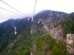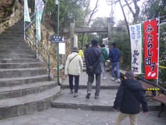 御在所ロープウェイは、元旦は初日の出運転の5〜8時と、9〜12時に運転する。9時過ぎに湯の山温泉駅に出向くと、冬山装備の登山者が集結していて、軽装の我々はちょっとビビる。ゴンドラなので、すぐに乗車できて気分はスキー場(実は、山頂には三重県で唯一というスキー場がある。1/6からオープン)。御在所岳の岩場を交えた急峻な山肌を眺め、振り返れば山あいの湯の山温泉や山麓の平野を俯瞰する。ロープウェイ途中の白い6号鉄塔は高さが61mもあり、ロープウェイの鉄塔としては日本一の高さだそうだ。