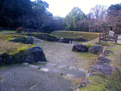 山麓駅の傍はかつて織田信長の居館のあった場所で、現在、発掘調査が進んでいる。これも立ち寄ってみる。居館の入口から続く虎口(こぐち)と呼ばれる折れ曲がった通路の両側には巨石の石垣が続き、壮観である。説明板によると、信長と会見したポルトガル宣教師ルイス・フロイスの著書『日本史』にも、この巨石列のことが書かれているとか。入口の通路を見るだけでも豪邸であったことが窺える。山麓の公園の中を通って、車に戻る。