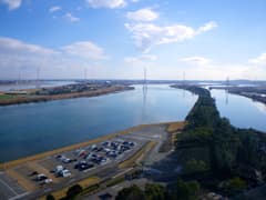 センター訪問を終え、揖斐川と長良川を仕切る油島千本松締切堤の上に車を走らせる。両側ともすぐそこに水面があり、とても不思議な光景。揖斐川と長良川の間を8km程走り、伊勢大橋で揖斐川を渡って桑名市に入る。行く手に鈴鹿山脈の山々が見え、その中に一際高い金字形の山が二峰並び立っている。あれが鎌ヶ岳と御在所岳のようだ。