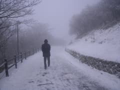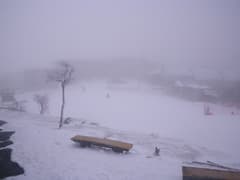 山上公園駅に着いて表に出ると、一面に薄く雪が積もり、灰色のガスに包まれている。本格的な雪景色は初めてのS&Sもビックリ。幅広い歩道を滑らないように注意して緩く下るとそり用ゲレンデがあり、小さな子供がそりで滑って遊んでいる。元気だなあ。