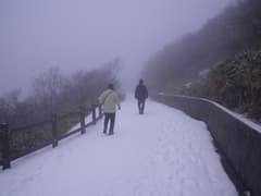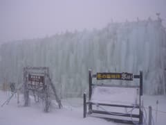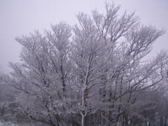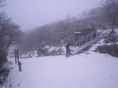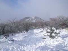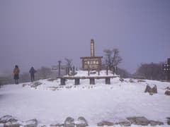 晴れて眺めが開けないかなとしばらく待つと、上空の雲が切れて青空が覗き、隣の(琵琶湖が見えると言う)望湖台のピークがガスの中から現れる。標高はあちら(1212m)の方がここ(1209m)よりも高く、つまり御在所岳の最高点なので踏んでおきたいところだが、雪が深そうなので止めておく。これ以上は晴れそうにないので、山上公園駅に戻る。駅の売店で濃厚な甘酒を飲んで温まったのち、ロープウェイで湯の山温泉駅に下った。