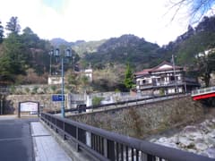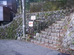 湯の山温泉駅から坂道を下り、涙橋を渡って三滝川沿いの道を上がる。こちらにも温泉旅館が点々とある。実はちょっと遠回りをしていて、湯の山温泉駅からのショートカットルートを合わせると「裏登山道一合目」の標識がある。