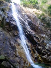 裏登山道に入り、ロープウェイの架線の下を通って急な山腹をジグザグに登る。小尾根上に登り着くと蒼滝不動がある。蒼滝へは尾根を乗り越して谷に下るが、帰りの登りがきつそうなのでS&Sはここで待機。私だけ滝を見に行く。蒼滝は落差50mとも言われ、花崗岩の岩壁の上に一直線に水を落とす豪壮かつ優美な滝である。