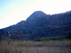 桐生を朝6時頃に車で出発。足利、葛生を経由し、秋山川沿いの県道秋山葛生線を北上すると、石灰石の採鉱跡が大岩壁となったピラミッド型の山が見えてくる。これが戸叶山だ。人工的な岩壁とは言え、なかなかの威容である。カメラに収めるために麓に車を停めると、側の空き地に軽四駆と橙色のジャケットを着用したおじさんが大勢集結している。これは……。ちょっと嫌な予感。