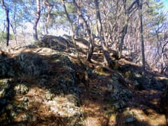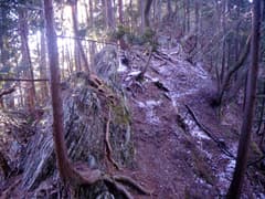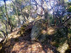 仙波尾根末端の取り付きは、先人のレポの写真で見た通り、防獣フェンスでガッチリと囲まれている。取り付けそうな場所を探して付近をうろうろ。西側の擁壁の切れ間(向かいに三日月神社がある)から樹林に覆われて薄暗い山腹を登る。岩場が現れ、右から巻いてガレた斜面を這い上がり、尾根上に出る。こちらからの取り付きは険しいのであまりお薦めしない(きりんこさんは東側からあっさり取り付いたそうである)。