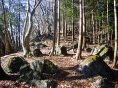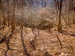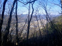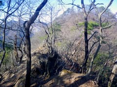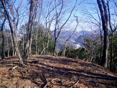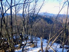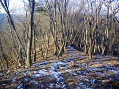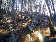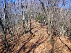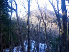 不動岳と塩沢峠の間は前回も歩いているが、あまり記憶にない。小さなアップダウンや岩場を過ぎ、塩沢峠に向かってゆったりと下る尾根となる。冬枯れの雑木林を透かして、熊鷹山から横根山にかけての山並みを遠望する。傾き始めた日差しが雑木林を金色に照らし、心が落ち着く風景ではあるが、日が暮れては大変だから、先を急ぐ気持ちもある。