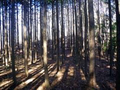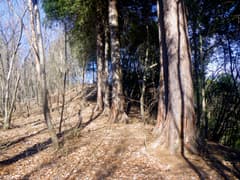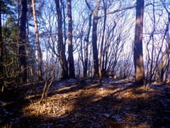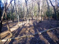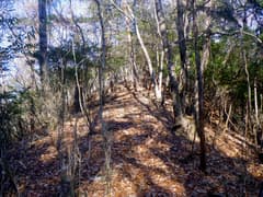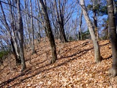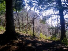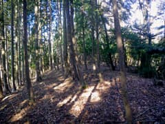 尾根の幅はだんだん広がって、意外に平坦なところもある。杉林や常緑樹、冬枯れの雑木林が混じって尾根を覆う。踏み跡やマーキングの類は全くない。下界の音はいつの間にか遠ざかって聞こえない。