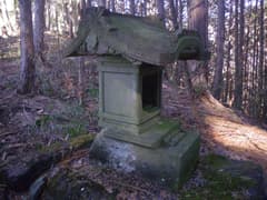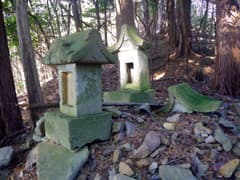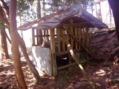 峠から尾根を緩く登ると、途中に木の祠を覆った小屋がある。痛みが激しく、何の神様を祀っているのかはわからない。