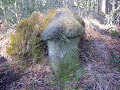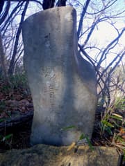 覆屋を過ぎて小ピークに登り着くと、東(右)の少し離れたところに石碑がある。先人のレポでこの辺にあると知っていて、目を皿にして探していたから気づいたが、最初の仮面林道ライダーさんはよくぞ見つけたものだ。石碑には種字と「玅音天講中 仙波村大蔵院」と刻まれている。きりんこさんによると「玅は妙の異体字で、妙音天は弁財天のこと。つまり弁財天信仰にまつわる石碑」だそうだ。後日調べると、仙波村は1889年に合併して常盤村になったので、この石碑はそれより前に建立されたことになる。