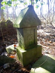 石碑を過ぎると杉林や雑木林の緩やかな尾根がしばらく続く。ヒノキが植林された平坦な鞍部で、西(左)側に石祠を見つける。これは先人のレポにはなかった(^^)。正面に「道祖神」と刻まれた変わった形のもので、側面に「明治四十五年三月 仙波 野部長吉 立之」の銘がある。この鞍部もよく見ると峠道の道型が残っている。